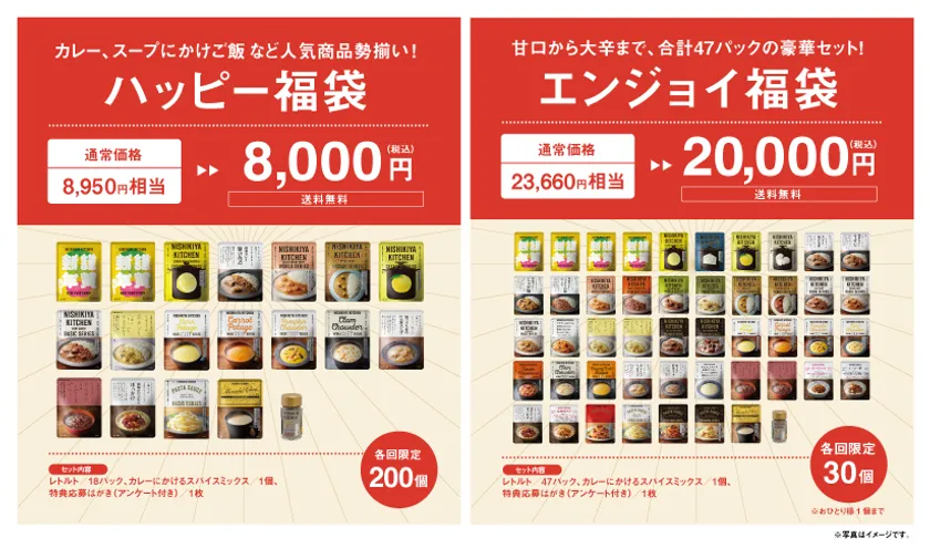 人気商品を食べ比べできる「ハッピー福袋」と、バリエーション豊かな豪華47パック入りの「エンジョイ福袋」、2種類のラインナップ