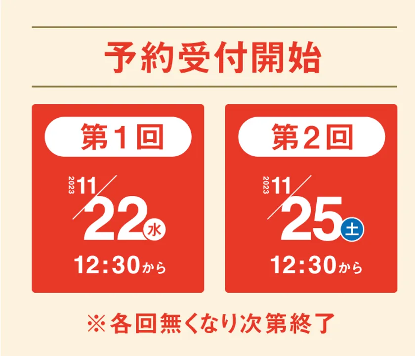 毎年、公式オンラインショップでは早々に完売となることから、今年もより多くのお客様にご購入の機会を設けるために、予約受付開始日を2回に分けています。