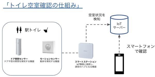 本取り組みでは、アクセルラボが提供しているIoT機器「ドア開閉センサー」「モーションセンサー」を駅構内のトイレに設置し、センサーからドアの開閉や人の動きを検知することで、トイレの空室状況を専用のWebページで公開します。駅の利用者は、QRコードを読み取ることでスマートフォンからリアルタイムでトイレの空室を確認できます。
