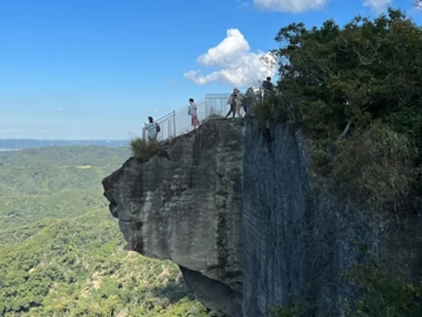 鋸山のシンボルでもあるスリル満点の絶景スポット。岩の先端から約80m下を見下ろすと、まさに地獄を覗き込むかのよう。断崖絶壁からは、なだらかな山と金谷港、遠方に東京湾が広がります。