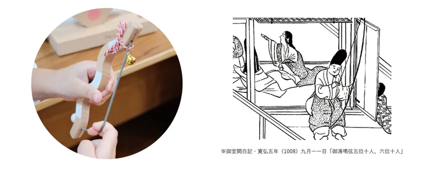 弓の弦をはじいて魔よけをおこない福を招く儀式「鳴弦の儀」を再現できるように、弓にバネを取付けました。