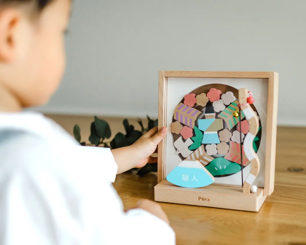 赤ちゃんがはじめて迎える初正月のお祝いとして、男の子に贈る「破魔弓」。お正月に飾ってお祝いすることはもちろん、プーカのコンセプトである触って楽しめる知育要素を取り入れたかわいい破魔弓ができました。