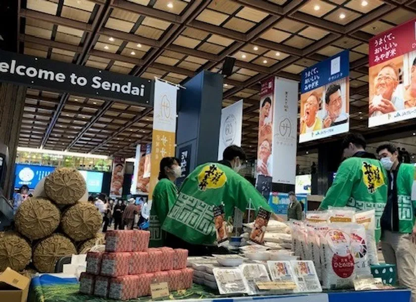60年間のご愛顧に対する感謝を伝えるとともに、「ササニシキ」のさらなる認知向上・理解促進を図るべく、2023年11月1日(水)から11月30日(木)までの1か月間、JR仙台駅にて大型フラッグと柱巻き広告を掲出しています。併せて、2023年11月3日(金・祝)から11月5日(日)までの三日間、JR仙台駅コンコース「ヨリ未知ポータル」にて販売会も開催。