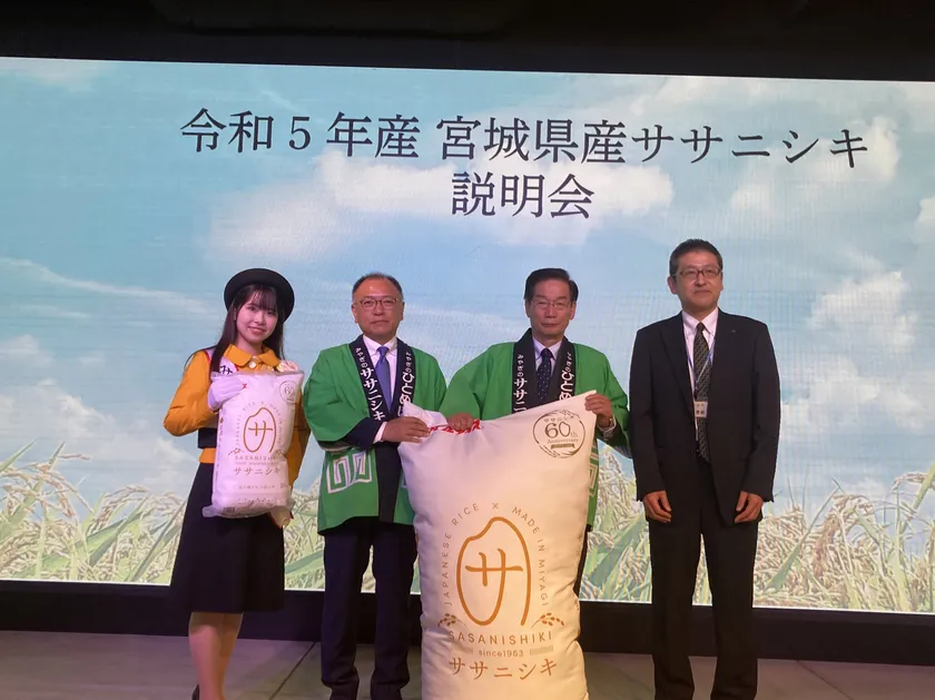 この度、宮城米を代表する銘柄の一つであるササニシキにつきまして、昭和38年に宮城県で誕生し、今年の秋に収獲された令和5年産で生誕60周年を迎えることができました。さっぱりとした食感と、おかずの味を引き立たせ、香り豊かな風味は和食との相性が良く、宮城県内はもとより、全国の皆さまに愛され続けているお米であります。ササニシキはかつて「東の横綱」として全国に名を馳せておりましたが、大冷害や大震災などに見舞われ、その度に販売棚確保に大きな影響を受けました。生産者の皆さまの熱い思いと、ササニシキを愛して下さった消費者の皆さまに支えていただいたおかげで、度重なる困難を乗り越え、今日の伝統銘柄と称されるべき、ササニシキを守り続けてくることができました。改めて心より感謝を申し上げる次第であります。