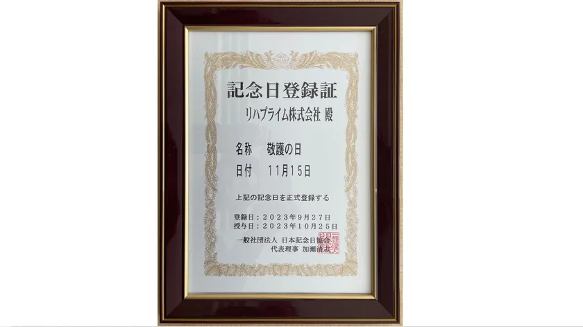 デイサービスなどを展開するリハプライムが制定した 「敬護の日(11月15日)」が日本記念日協会により記念日登録認定!
