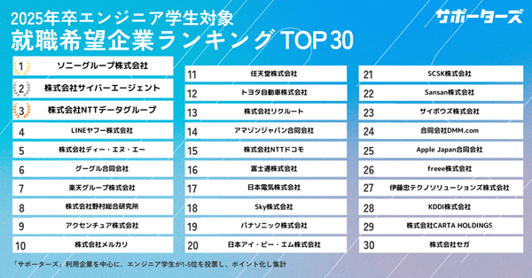 サポーターズ、「2025年卒 エンジニア学生対象 就職希望企業ランキング」TOP30を公開!