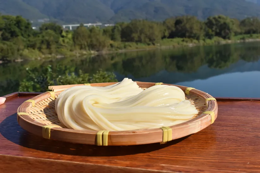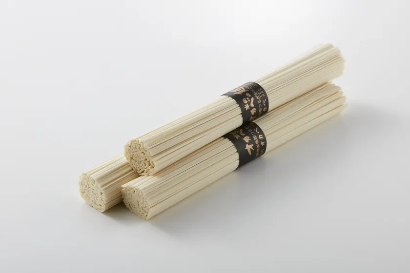 当社は、徳島県半田に約300年続く伝統の手延べ製法で半田そうめんを製造しています。半田そうめんを製造する会社の中では後発になりますが、新参者だからこそ固定観念にとらわれず、麺職人の社長を先頭に日々試行錯誤しながら麺を作っています。
