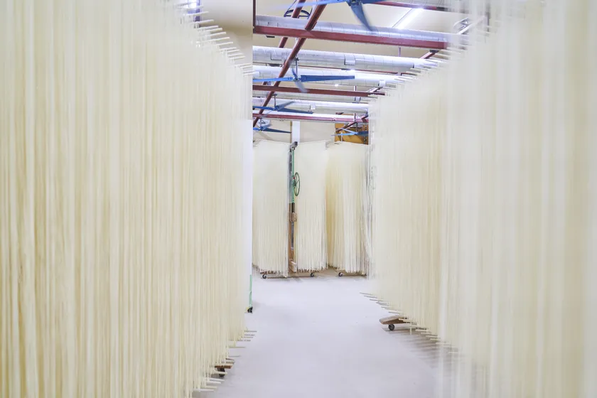オカベでは製造の各工程において、しっかり時間を取って麺の熟成を促します。また最終工程の乾燥でも、麺の表面は乾燥させながらも中心部の水分は逃さないために、急激に乾かすのではなく時間をかけて低温でゆっくりと乾燥させていきます。そのため一つの麺が出来上がるのにかかる時間は約30時間。