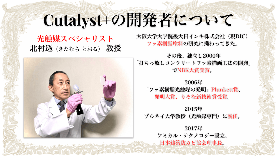 Cutalyst+(カタリスト)は、世界初技術である「光触媒×銅×銀」が配合された商品で、従来の光触媒に「銀(Ag+)」と「銅(Cu2+)」が加わり掛け合わされた「ハイブリッド光触媒塗料」である。