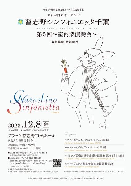 公益財団法人習志野文化ホール(理事長:植松 榮人)主催、『習志野シンフォニエッタ千葉 第5回~室内楽演奏会~』が2023年12月8日 (金)にプラッツ習志野市民ホール(千葉県習志野市本大久保3-8-19)にて開催されます。