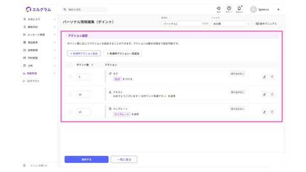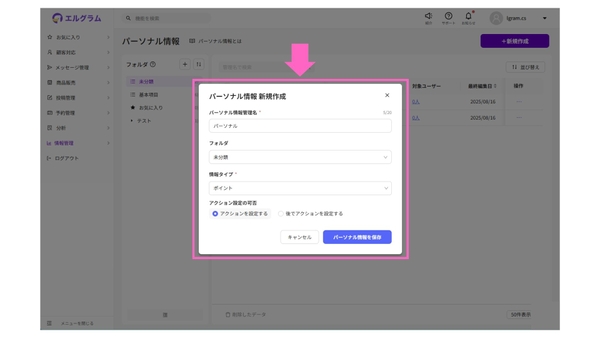 今回のアップデートでは、新規作成時にパーソナル情報の登録とあわせて、アクション設定の有無を選択できるようになりました。これにより設定の流れが分かりやすくなり、初期段階で必要な項目を整理しやすくなりました。
