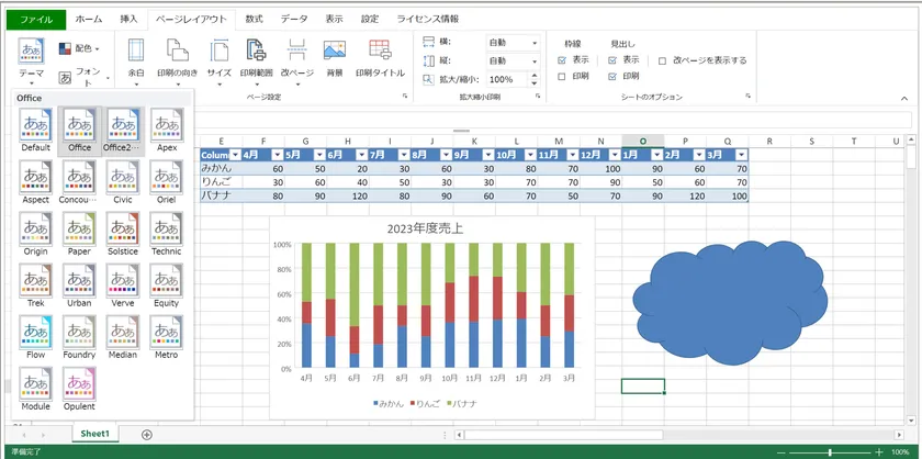 Excelと同様にテーマを指定してワークブック全体のデザインを一括で変更できるようになりました。配色やフォントのみを個別で変更することも可能です。
