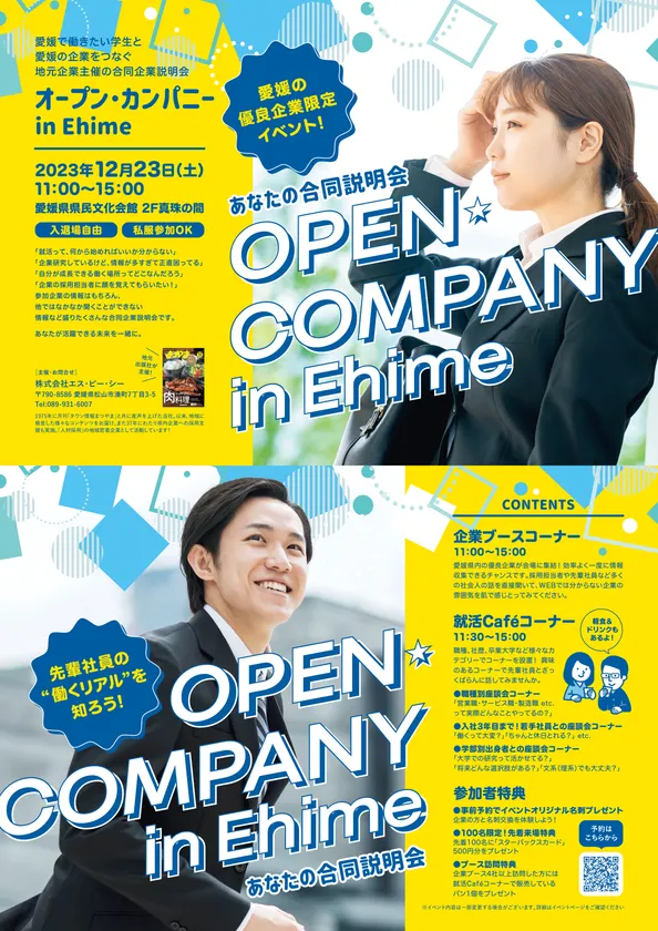 『タウン情報まつやま』などを出版している株式会社エス・ピー・シーは、愛媛で働きたい学生と愛媛の優良企業をつなぐ合同説明会「オープン・カンパニー in Ehime」を2023年12月23日(土)に初開催いたします。愛媛県内の優良企業25~30社が出展予定。企業ブースでの会社説明のほか、就活Cafeコーナーでは、職種別・卒業学部別・若手社員など様々なカテゴリーの座談会を開催。普段聞けないような情報をじっくり聞くことができます。イベントの予約受付は2023年11日27日(月)より開始しています。