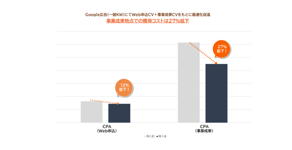 当社事例では、Google広告プラットフォームに事業成果データを取り込むことで最大27%の顧客獲得単価の低下につながりました。