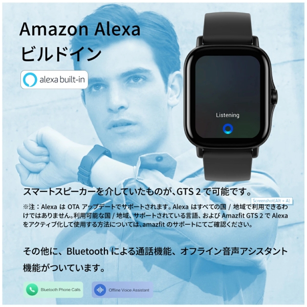 デザイン性と機能性を兼ね備えた「GTS 2」が登場。滑らかな3Dカーブのベゼルレスデザインで、シンプルなのに存在感があります。健康やフィットネスのモニタリングだけではなく、音楽の保存と再生も可能でアマゾンアレクサビルトイン!多機能なスマートウォッチです。
