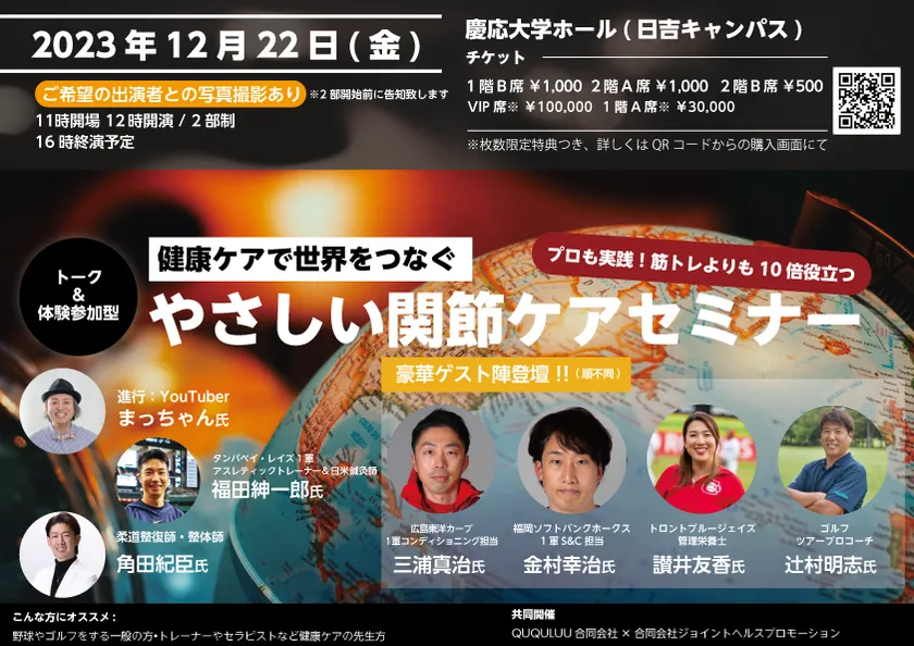 健康ケアのグッズ開発や健康ケアイベントを企画している合同会社ジョイントヘルスプロモーション(所在地:神奈川県横浜市、代表:角田紀臣)は2023年12月22日(金)12時より慶應大学にて日米プロ野球、プロゴルフ、世界を相手にするセラピストの視点から関節ケアの重要性を発信するセミナーを各球団・関係者許可のもと執り行うこととなりました。