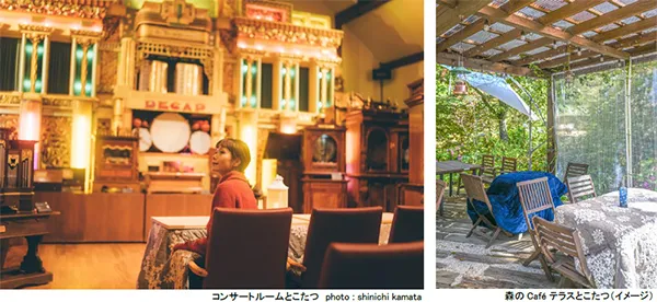 コンサートルーム、森のCafe(※1)テラス席、オルゴール組立体験部屋、ツリーハウス、SIKIドームなど施設内の至る所にこたつを設置する他、併設の森のCafe(※1)では期間限定のあったかメニューをご用意しています。