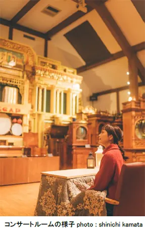 コンサートルームの最前列には、こたつ席を設け、暖まりながらゆっくりと音楽が鑑賞できます。(8席、先着順)