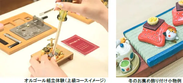 オルゴール職人のサポートのもと、自分だけの音色のオルゴール作りが体験できます。お好みの曲、ケース、コース(一般コース、上級コース)を選んで、完成したオルゴールは持ち帰りできます。下記日程は、特設のこたつ席(1台、先着順)で、あたたまりながらじっくり体験ができます。冬にお薦めの飾りつけ小物もご用意しています。