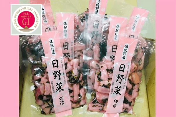 滋賀県日野町原産のカブを使った甘酢漬です。日野菜(ひのな)は日野地域原産のカブで500年前の、室町時代から日野町で栽培されている伝統野菜です。