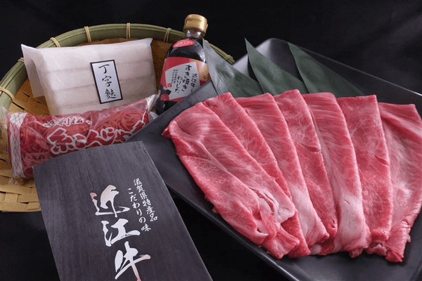 日本三大和牛ブランド「近江牛」のすき焼きセットです。お肉と割り下に近江八幡名物の赤こんにゃくと丁子麩が入っています。あとはお好きな具材でオリジナルのすき焼きをお楽しみください。