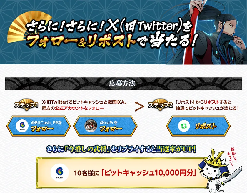 期間中、X(旧Twitter)アカウント「@BitCash_PR」及び「@IxaPr」の両方をフォローし、対象ポストをリポストすると抽選で10名様にビットキャッシュ10,000クレジットが当たります。