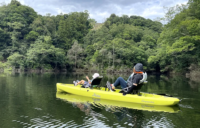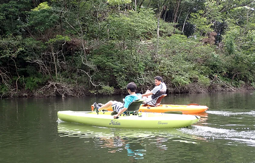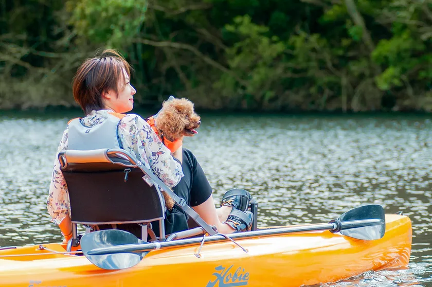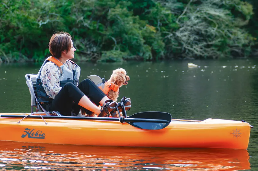 kiondのカヤック体験では「Hobie」というカヤックを使用しています。Hobieは、転覆を心配することなく自然を堪能できる革新的な足漕ぎカヤックです。自然を壊さないデザインと配慮が施されており、環境への負荷を最小限に抑えながら水上アクティビティを満喫できます。お子さまもペットも、どなたでも安心して水上散歩を楽しめるカヤックです。