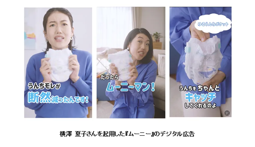 ユニ・チャーム株式会社(代表取締役 社長執行役員:高原 豪久)は、ベビーケア用品『ムーニー』のデジタル広告に、三人のお子さんをお育てになっている横澤 夏子さんを起用して、子育てに関する情報を、YouTubeやInstagram等で発信することをお知らせします。