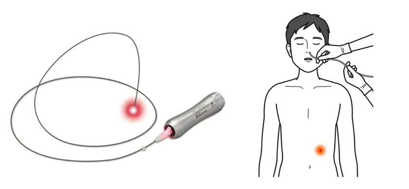 NCI独自の集光技術を応用し、光源に生体透過性の高い赤色光を採用した「タムガイド光源装置」と、再利用による感染を回避する目的の検知機能を付加した滅菌済の「タムガイドファイバー」から構成されます。生体を透過しやすい波長を用い、簡便に体外から栄養チューブの先端を視認できるようにいたしました。またNCIはどのような場所でも使用できるように持ち運びができるポータブル光源を設計しました。これにより100Vのコンセントがない場所でも使用出来ます。栄養チューブの先端が光ることにより、体の外から先端位置を確認できることは、これまでになかった方法であり革新的医療機器に匹敵する製品となります。