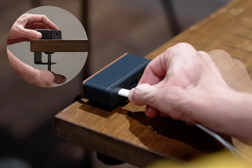 本体付属のクランプで机にしっかり固定することができます。片手でコードを抜き差しできるから、動作が手軽でスマートに。手がぶつかった拍子に充電ポートが落下するなどの煩わしいストレスを解消します。