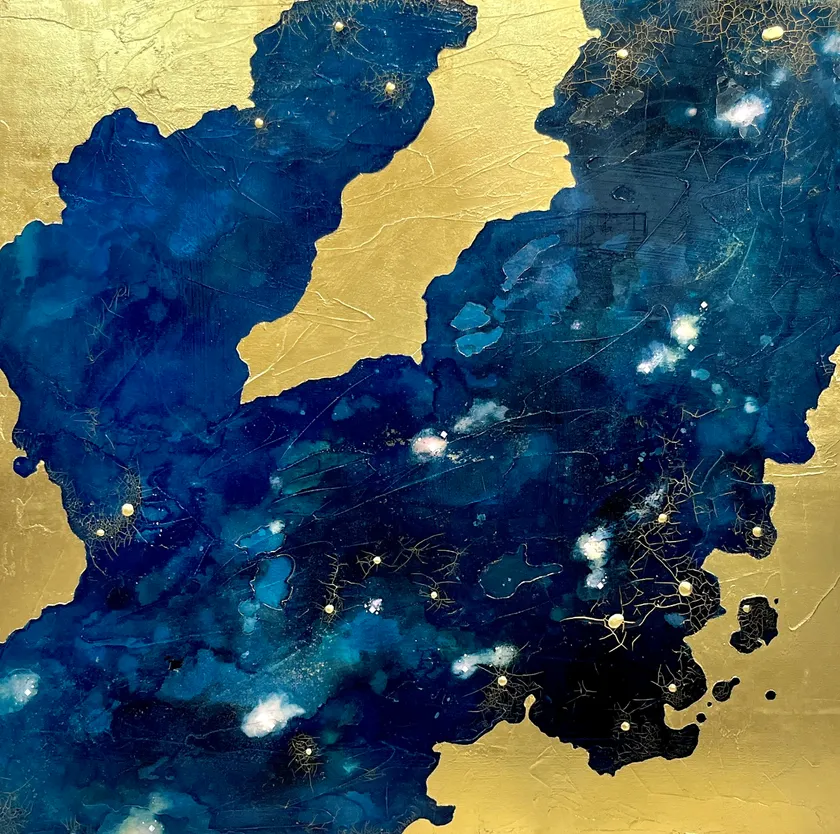 美の起原展において2年連続奨励賞を受賞されていますが、今回は特徴である水彩絵具に金継ぎのようなひびを取り入れた新たな手法に挑戦されていて、審査員一同が注目する作品として大賞となりました。画面の主となる青色は縁取られた金箔に劣らず主張があり、従来の水彩のイメージを覆す深みを感じさせます。