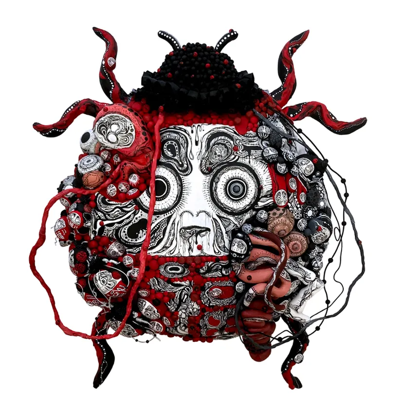 生と死を司り、作家自身を投影した「てんとう虫ダルマ」はそのビジュアルのインパクトに加え、細部まで描きこまれており、表現することへの執念を感じさせます。細密なダルマの描写とテキスタイルによる物質的な存在感が鑑賞者を魅了します。