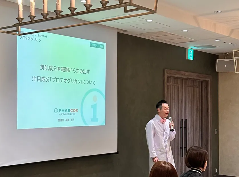 優れた保水力を持つプロテオグリカンは、美肌成分を生み出す線維芽細胞や、コラーゲンやヒアルロン酸などの美肌成分を増やす働きがあります。高橋さんからはプロテオグリカンの効果やメカニズム、エビデンスについて語られ、耳かき1さじ程度の量である5mgを2週間経口摂取することで、肌のシワやたるみ、弾力の改善が認められているという、インナーケアにおけるプロテオグリカンの魅力について詳しくご紹介いただきました。ご参加いただいた方の中には、講演後にも熱心に質問をされている方もいらっしゃいました。短期間少量で効率よくハリのある肌を目指すことができるプロテオグリカンについてしっかりと学んでいただける時間となりました。