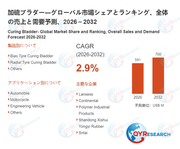 QYResearchが発表した新たな市場調査レポート「加硫ブラダー―グローバル市場シェアとランキング、全体の売上と需要予測、2026~2032」によると、世界の加硫ブラダー市場規模は2025年の約572百万米ドルから2026年の591百万米ドルへと順調に拡大すると見込まれ、予測期間中は年平均成長率(CAGR)2.9%で成長し、2032年には700百万米ドルに達すると予測されている。
