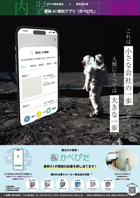 長年、内装業界では使用資材のメーカーや品番の特定に時間・労力がかかることが課題で、使用資材によっては品番の特定ができないものもありました。このような課題を解消するべく、同志社大学と共同で、テクスチャ(画像の色目や凹凸、模様等)から資材のメーカーや品番を識別する技術を開発してまいりました。この度、第一弾として内装資材の壁紙をスマホで撮影するだけで、メーカー、品番を識別するスマホ用アプリ「かべぴた」を発表いたします。近日中にベータ版を無償リリースし、業界はもちろん、広くユーザー様に御使用いただき、改善点やデバッグを進めていく予定です。