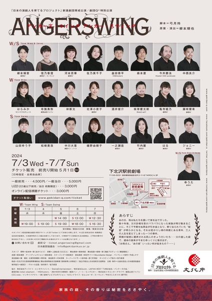公益社団法人日本劇団協議会主催、『ANGERSWING』が2024年7月3日 (水) 〜 2024年7月7日 (日)に駅前劇場(東京都 東京都世田谷区 北沢 2-11-8)にて上演されます。