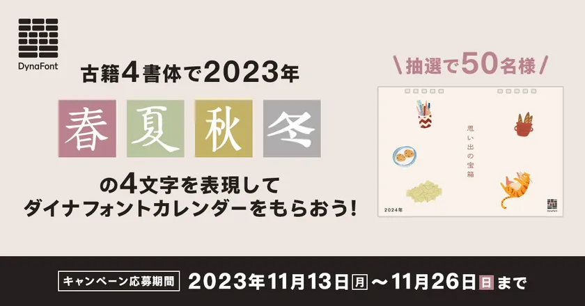季節の情緒も感じられるフォント「古籍4書体」を用いて表現 “2023年春夏秋冬の4文字”を11月26日まで募集! 抽選で50名様に「ダイナフォント2024年カレンダー」プレゼント