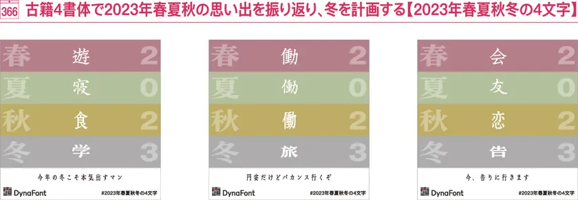 “終わり良ければ全て良し!”の精神で、思いどおりの春夏秋を過ごされた方も、今一つだったと感じている方も、2023年の冬を充実させることで最高の1年として完結していただくために、ダイナフォントと一緒に2023年春夏秋の思い出を振り返り、“2023年春夏秋冬の4文字”にて表現することで冬を計画する本取り組みが誕生しました。