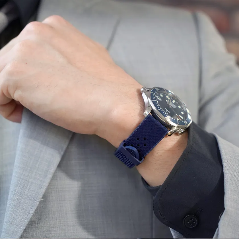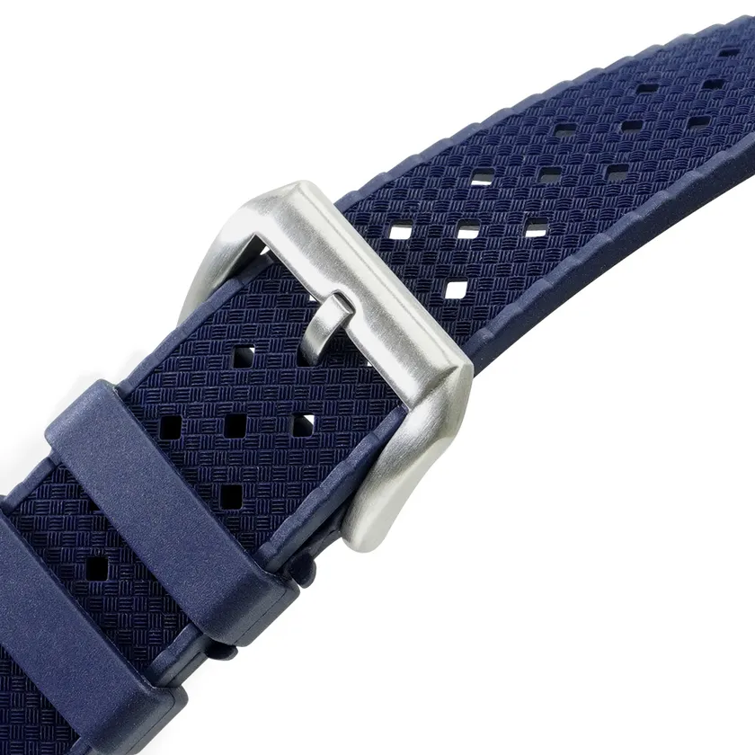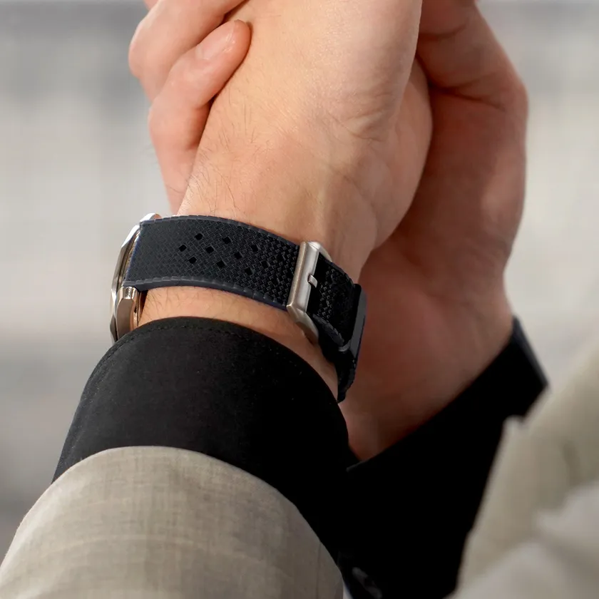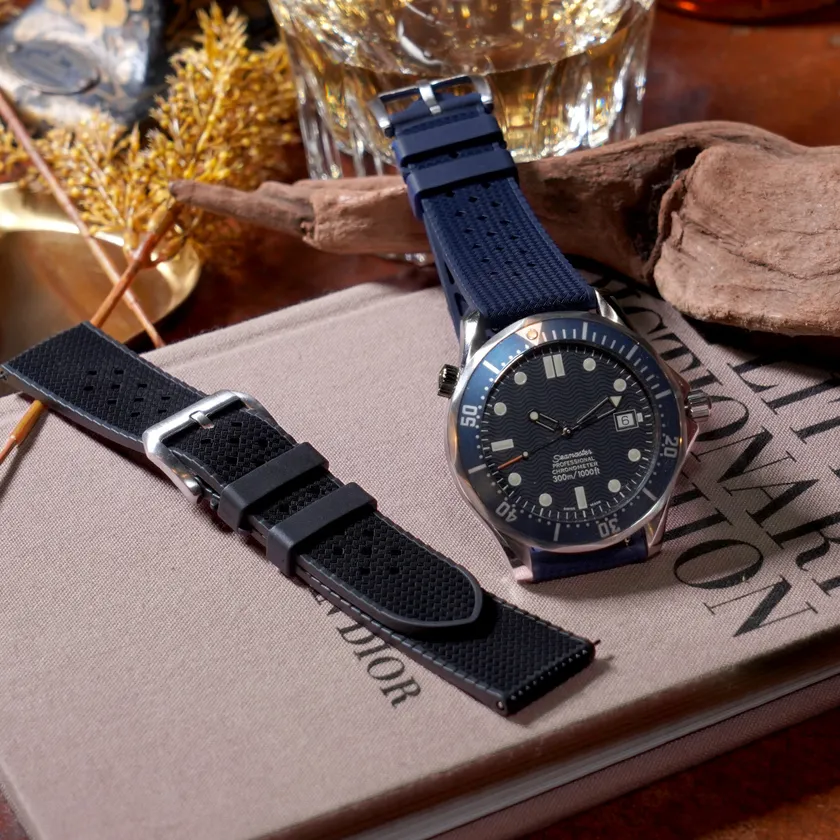 1960年代に様々な時計ブランドで人気を博したトロピックラバーを、高品質なカウチックラバーを用いて製作しました。ひし形に開けられた小穴と表面の立体的な模様は、レトロでありながらもモダンなデザイン。ビンテージウォッチはもちろん、ダイバーズウォッチにもお勧めです。また、ラバーのマットな質感が上品で落ち着いた印象を与えてくれます。