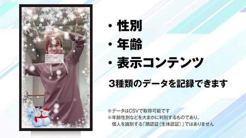顔認識機能を利用するとユーザーの年齢、性別、表示コンテンツをそれぞれ記録し、データとして蓄積できます。蓄積されたデータを利用すると、コンテンツ別の利用数、利用する年齢層、性別の内訳などが取得できるため、効率的なサイネージ運用や市場分析を行うための参考データとしてご利用いただけます。保存されたデータは、CSVとして出力し、使用状況をグラフ化することも可能です。