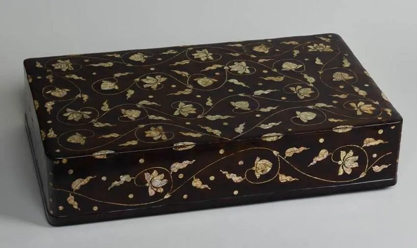 貝殻を用いて文様をあらわす螺鈿漆器は、朝鮮半島で盛んに制作されました。高麗時代には貝を細かく切り出して菊や牡丹の唐草文様を施し、朝鮮王朝時代には長寿や子孫繁栄などの吉祥文様から文人が好んだ詩文などの文字と絵画の組み合わせまで、多様な文様が螺鈿であらわされました。