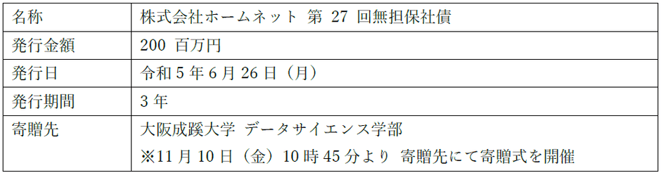 テクノロジーで気軽な住み替えをサポートする株式会社property technologies(以下「当社」)のグループ会社である株式会社ホームネットは、株式会社山陰合同銀行(以下「山陰合同銀行」)を引受先とする、ごうぎんSDGs私募債(教育機関寄贈型)を発行し、発行手数料の一部を用いて学校法人大阪成蹊学園 大阪成蹊大学 データサイエンス学部(以下「大阪成蹊大学 データサイエンス学部」)へ山陰合同銀行と連名にてドローンを寄贈し、2023年11月10日(金)に寄贈式を行いました。