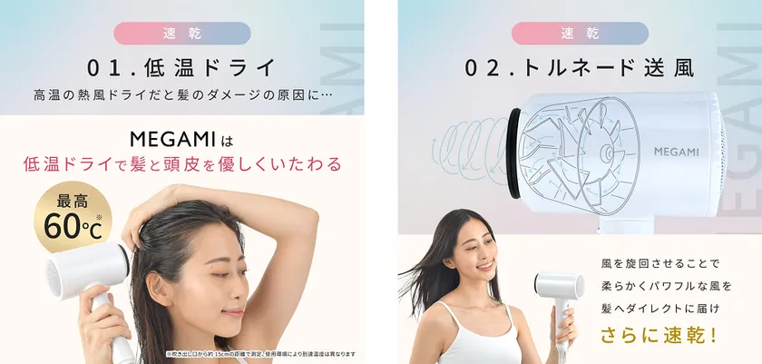 『MEGAMI』は遠赤外線を放出するセラミックを3つ搭載し、大量の“トリプル遠赤外線”により髪の内部の水分が振動することで、高温の熱風に頼ることなく、低温速乾を実現。さらに吹出口から出る風を旋回させた「トルネード送風」により、柔らかなのにパワフルな風をダイレクトに届けることで速乾力を高めました。