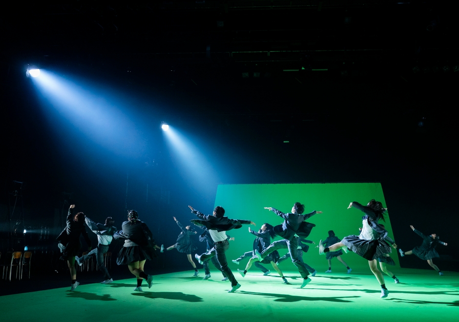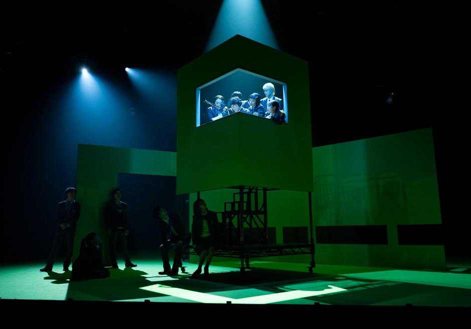 舞台上は照明や機材が剥き出しの状態で、セットも無造作に置いてある。普段なかなか見る機会のない舞台機構や、床やセットに使われている鮮やかな緑色が印象的だ。そこに開演前から生徒役のキャストが一人、またひとりと現れ、ステージ後方にある椅子に座って雑談を始める。休み時間のような雰囲気とポップな中にも不穏さを感じさせる音楽で、これから始まる作品への期待が高まっていく。