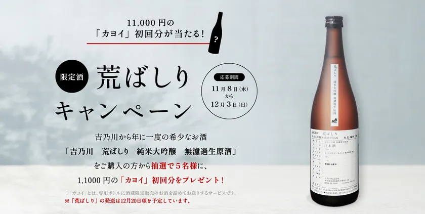 公式オンラインショップで「吉乃川 荒ばしり 純米大吟醸 無濾過生原酒」を予約購入いただいた方から抽選で5名様に、専用のステンレスボトルに吉乃川のお酒を詰めてお送りするサービス「カヨイ」初回1回分(11,000円)をプレゼント。ご注文いただいた「荒ばしり」とは別に、プレゼントは2024年1月26日(金)に発送します。(※抽選結果は発送をもってかえさせていただきます。)