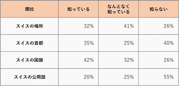 スイスと聞いて多くの人は何を思い浮かべるのでしょう。スイスに関係するものを挙げ、「スイス由来、もしくはスイスと関係の深いものだと知っているか」について聞いてみました。