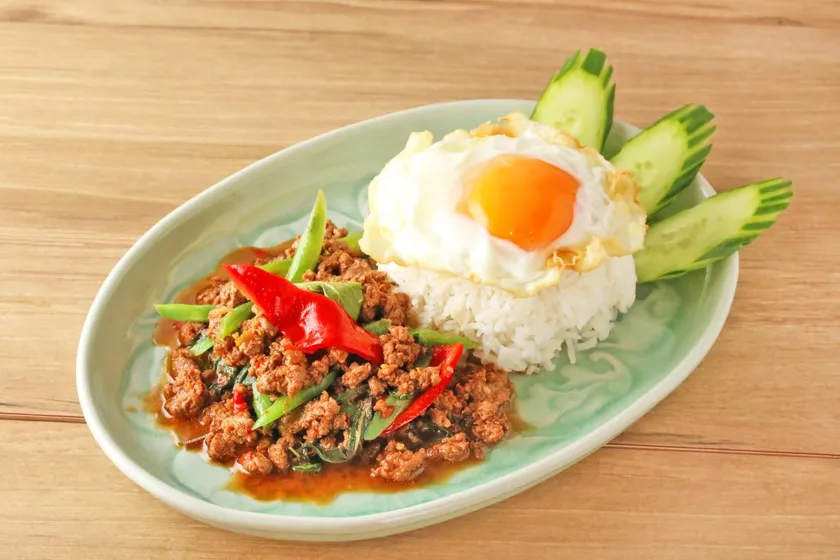 粗挽きの牛肉を自家製の唐辛子やホーリーバジルと共に、大人気のガパオにしました。