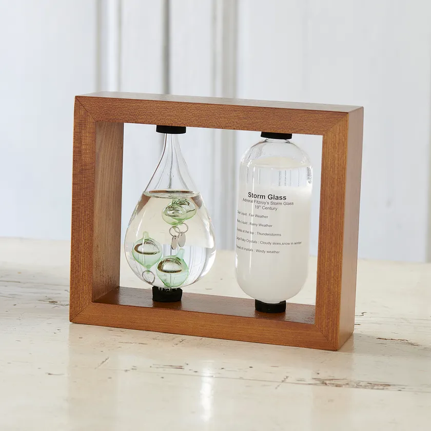 木目の美しい天然木製フレームに、ストームグラスと温度計をセットしたアイテム。ストームグラスは、19世紀初頭のヨーロッパで気象予報ツールとして使われていました。ガラス容器内の結晶が天候により形を変える様を眺められます。温度計はガラス内の球体の浮き沈みにより、気温の目安が分かる仕組みです。