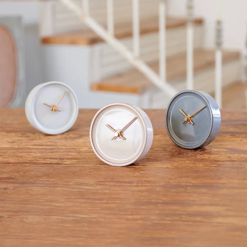 岐阜県多治見市でつくられた、美濃焼の置時計。まゆ、もも、くじらの3つのバリエーションがあり、釉薬が織りなす美しい質感が魅力です。ゴールドの時針と分針が、時の流れを優雅に伝えてくれます。焼き物の柔らかな質感と、和の雰囲気を感じる佇まいが、落ち着いた品の良い空間を演出。贈答用としても喜ばれるでしょう。