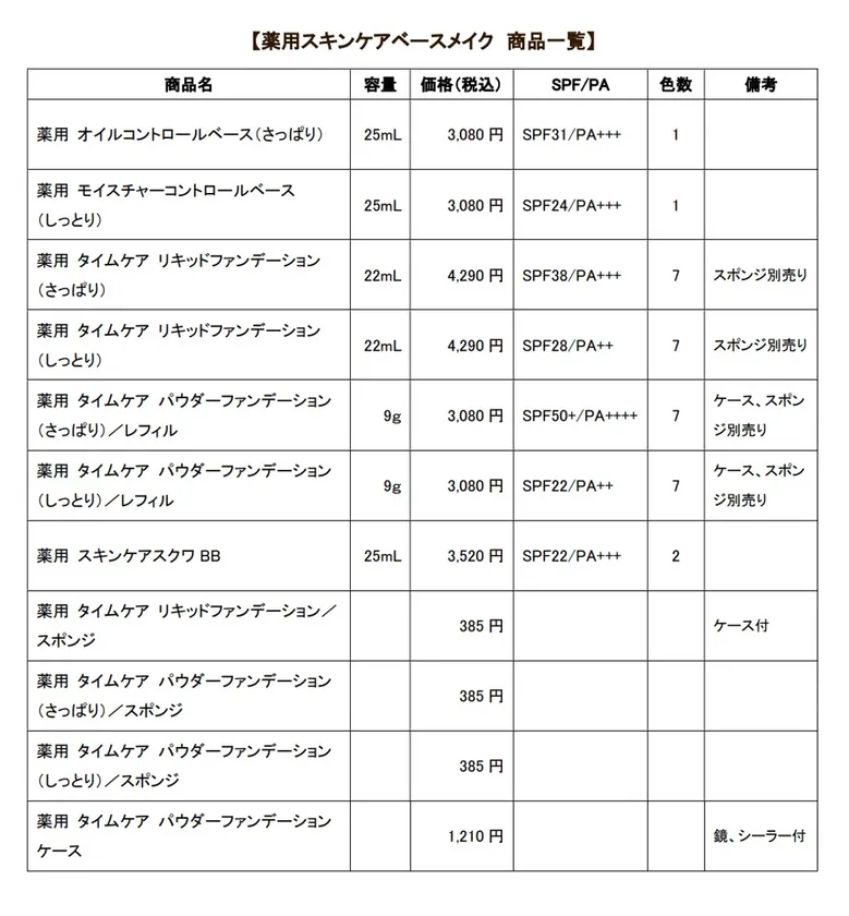 ※4販売名 薬用 オイルコントロールベース(さっぱり) CN01 ※5販売名 薬用 タイムケア パウダーファンデーション(しっとり) OC01 ※6販売名 薬用 モイスチャーコントロールベース(しっとり) CN01 ※7販売名 薬用 タイムケア リキッドファンデーション(しっとり) OC02 ※11販売名 薬用 タイムケア リキッドファンデーション(さっぱり) OC02 ※12販売名 薬用 タイムケア パウダーファンデーション(さっぱり) OC02